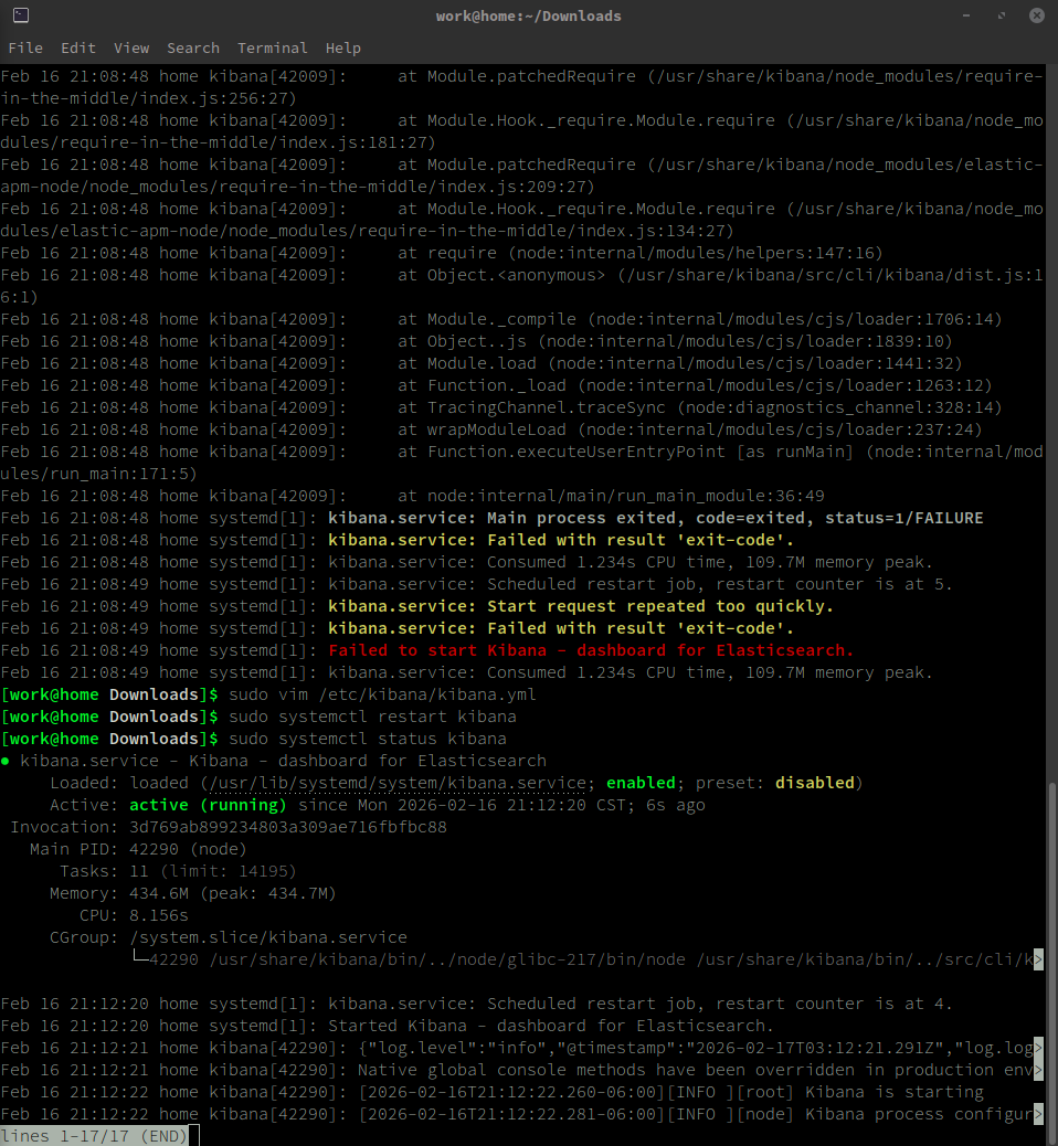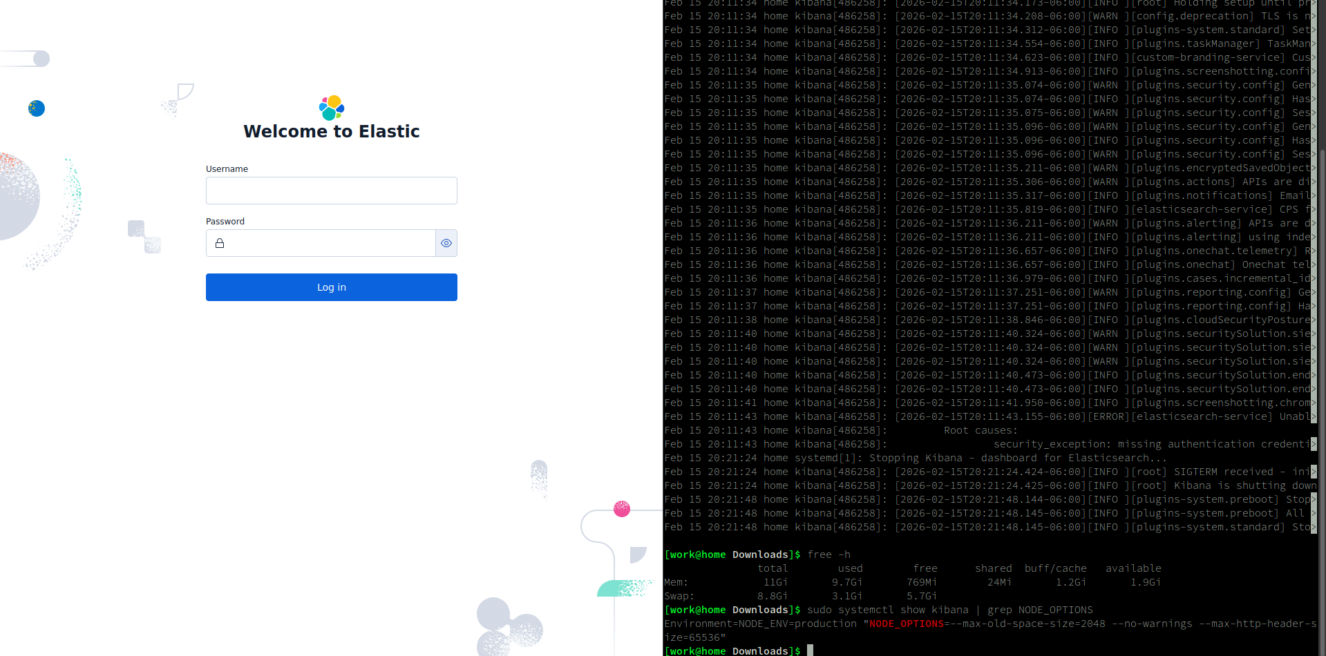The first issue I solved was just matching the versions; apparently the Elasticsearch I pulled off the AUR was 9.3.0-SNAPSHOT, whereas Kibana was just 9.3.0. A quick reinstall (2nd bullet bitten) seemed to fix the issue, yet Kibana was still stuck in a crash loop. There was seemingly an issue with Kibana and ES not consistanly communicating through Ipv6 that I fixed, yet still no working Kibana. More journalctl digging showed that this time it was the authentication method in Kibana's config file that wasn't properly set up.