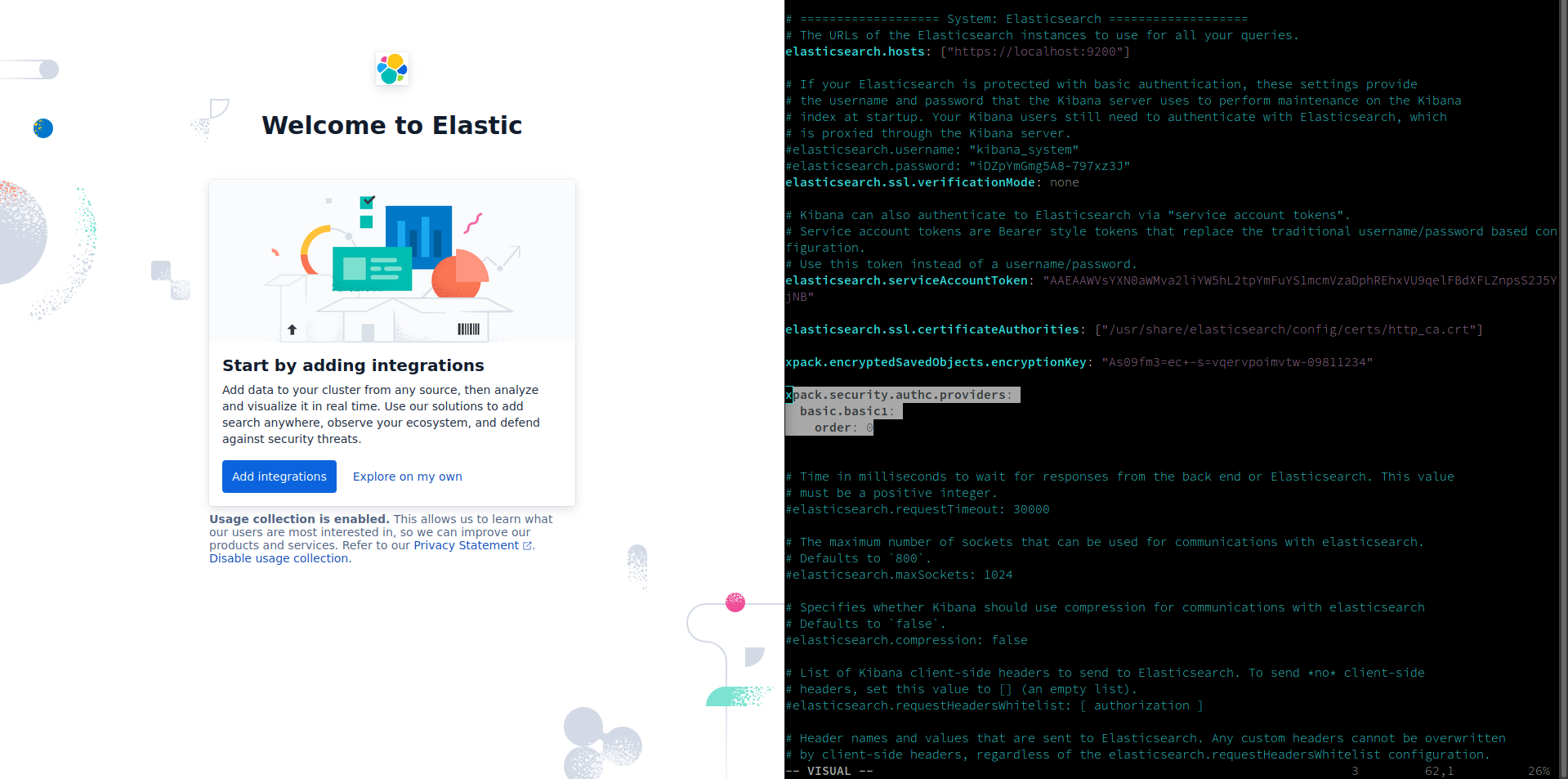 After installing everything from the AUR I began configuring both Elasticsearch and Kibana to be able to speak with each other, which turned out to be easier said than done. I was able to get Elasticsearch up and running fairly quickly, generating a password and using curl to verify all was good. Kibana, however, was another demon.