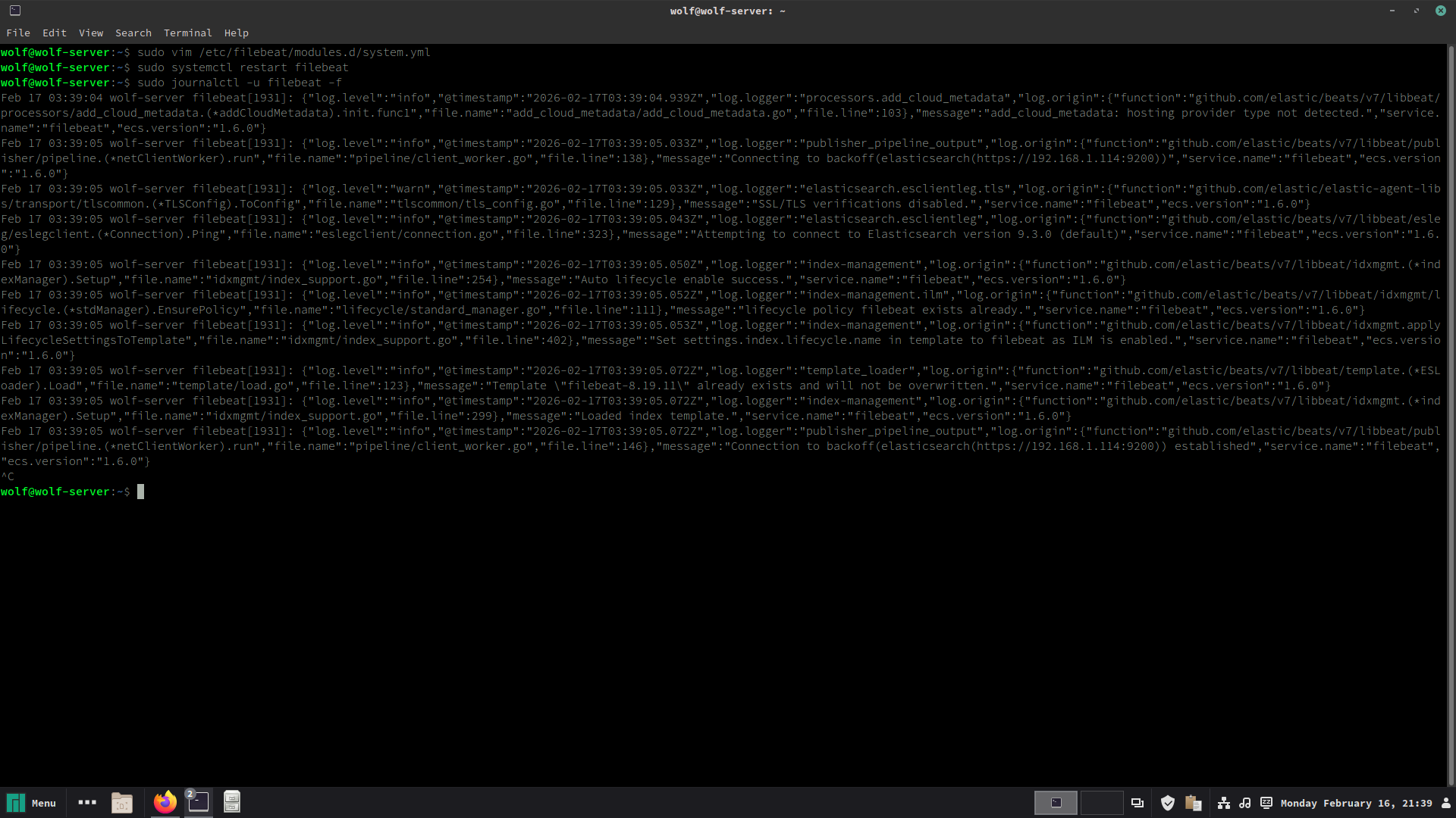 My first mistake was picking Wazuh and trying to get that to work on an Arch-based distro. Since there isn't an official release of Wazuh for Arch I tried to get the community maintained version off the AUR, but quickly realized there was just too much to fix before I could get anything started. Specifically, for whatever reason the AUR maintained Wazuh didn't come with a certificate generation script, and after looking into how I could generate them myself it just didn't seem worth it. So I bit my first (of many) bullets and pivoted to using ELK (Elasticsearch4 + Kibana) on my desktop and Filebeat on the Ubuntu machine.