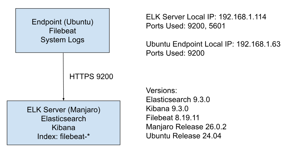 Essentially, Filebeat will collect and send the system logs from the Ubuntu machine over to Elasticsearch running on the Manjaro Desktop via HTTPS. Kibana is then used to view and manage the data that Elasticsearch outputs, serving as the frontend of the system.